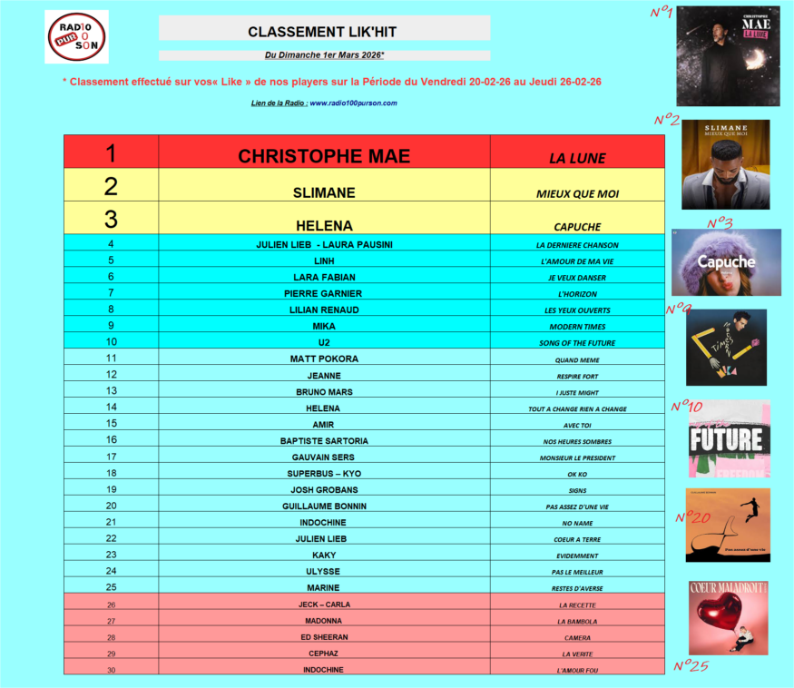 Classement Lik'Hit : Dimanche 01-03-26