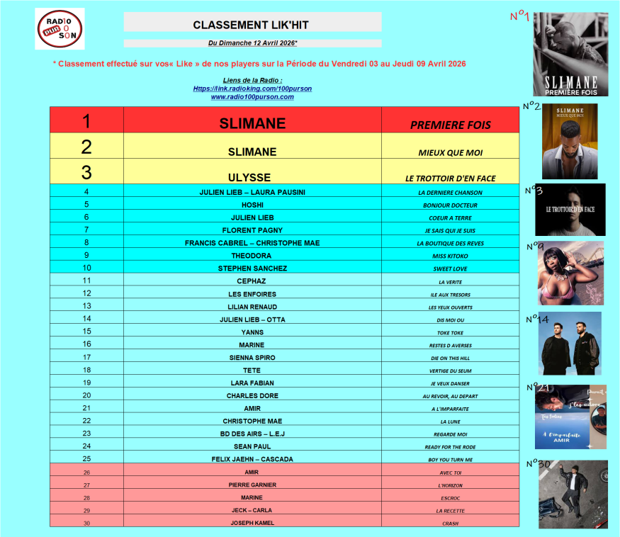 CE CLASSEMENT EST REALISE VIA VOS LIKE SUR NOS LIENS RADIO (Coeur ou Pouce) ! et seulement via ce biais.