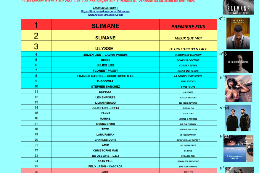 CE CLASSEMENT EST REALISE VIA VOS LIKE SUR NOS LIENS RADIO (Coeur ou Pouce) ! et seulement via ce biais.